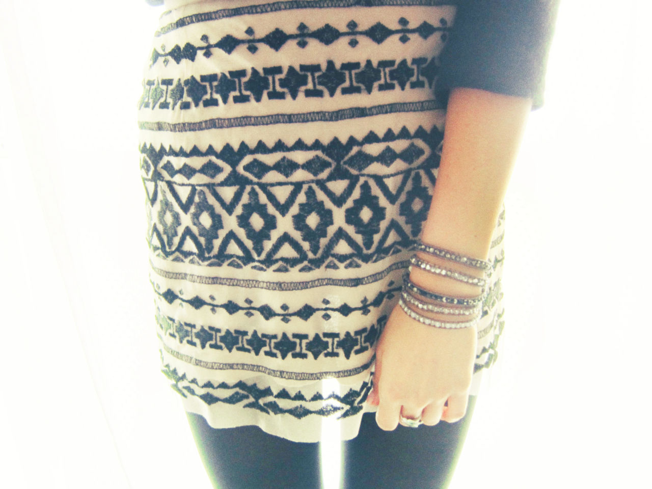 Printed skirt and crystal wrap bracelet by Chan Luu